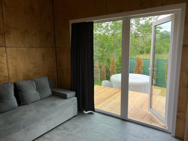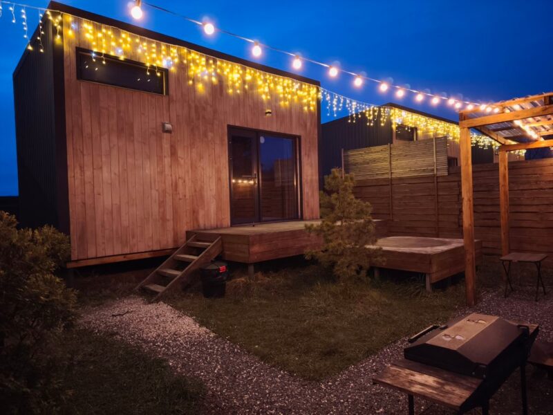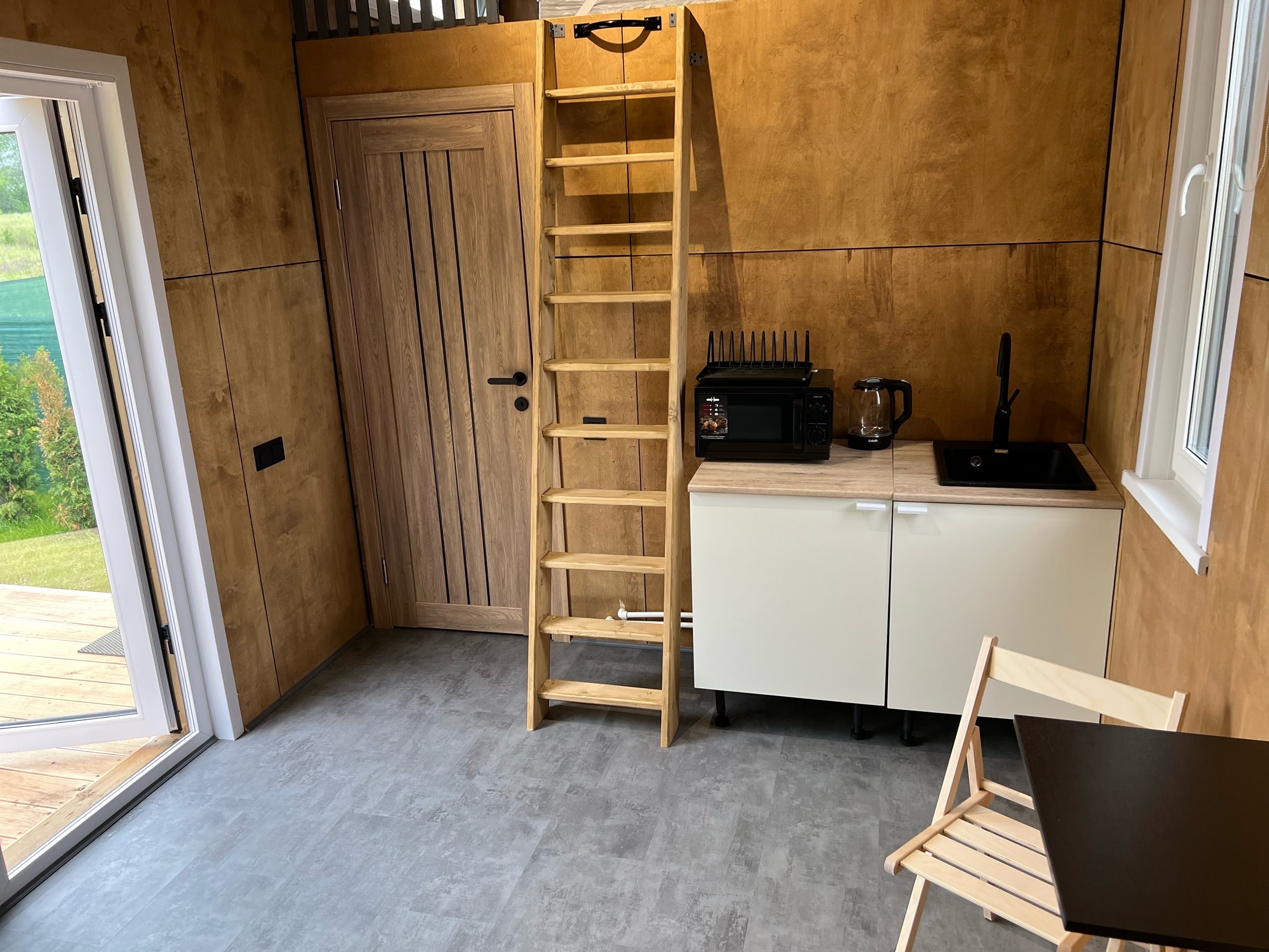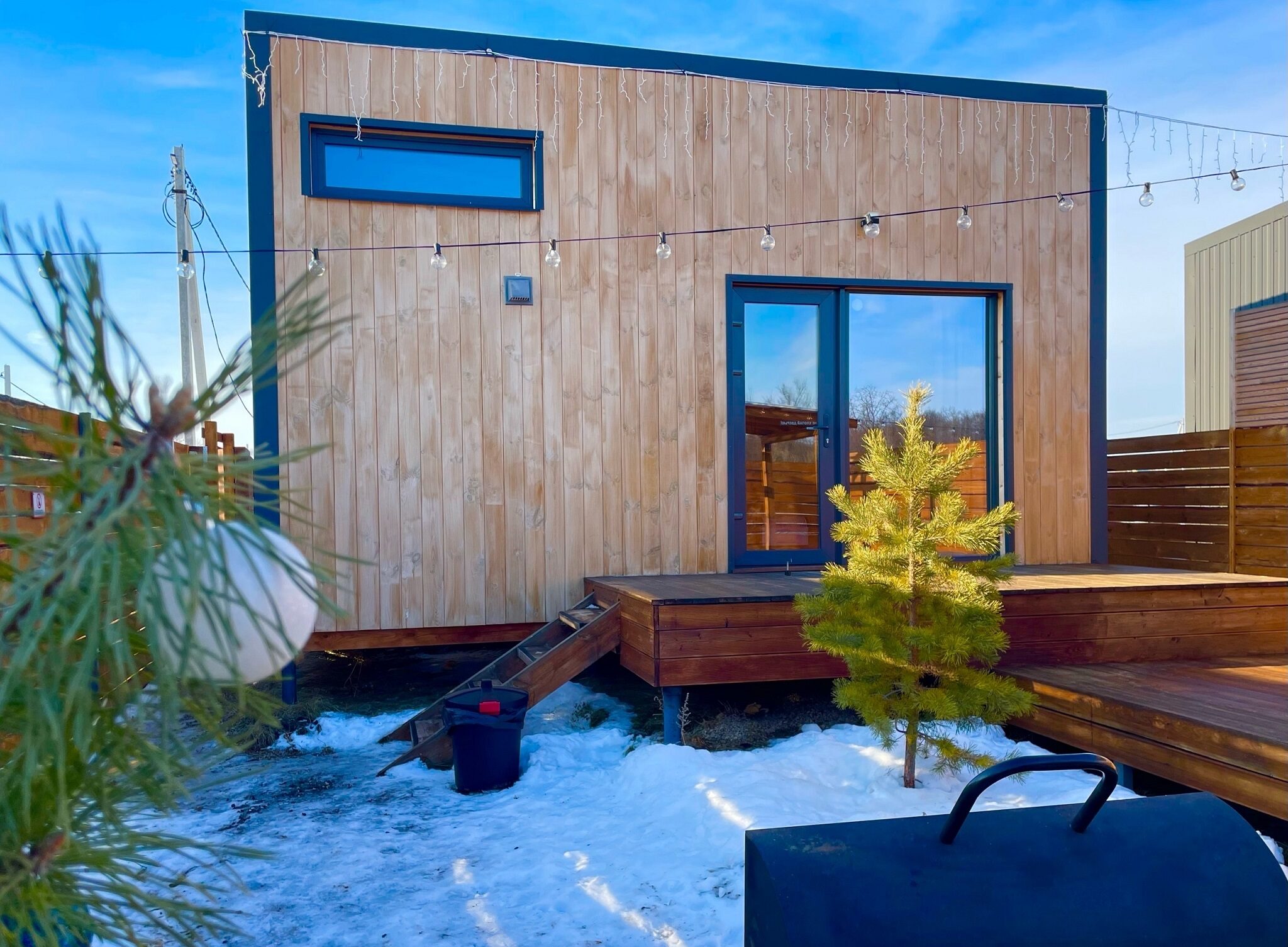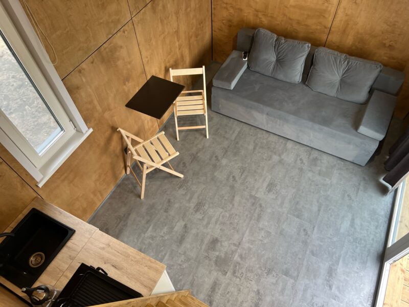 Каждый домик оборудован панорамным окном, открывающим вид на лес, обеспечивая комфорт и ощущение единения с природой. Внутри гостей ожидает просторная комната площадью 18 квадратных метров, оснащённая двуспальным матрацем на мансарде и раскладным диваном, рассчитанным на двух взрослых и двух детей. Дополнительные удобства включают в себя сауну, санузел с душем и туалетом, а также кухню с необходимым оборудованием: микроволновые печи, холодильник, кухонный гарнитур и посуду.