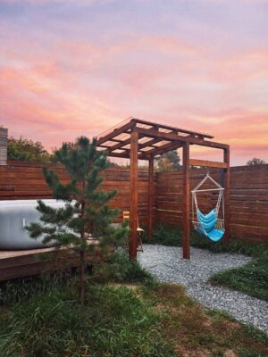 Территория базы отдыха включает личные террасы с барбекю, качелями и деревянным столом, создавая атмосферу домашнего комфорта и позволяя гостям наслаждаться вкуснейшими блюдами, приготовленными на открытом огне. Во дворе расположены удобные парковочные места с видеонаблюдением, обеспечивающие безопасность автомобилей гостей.
