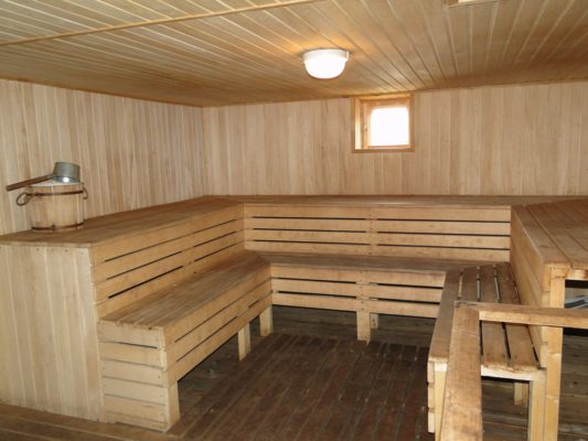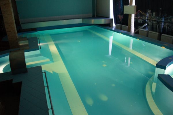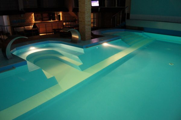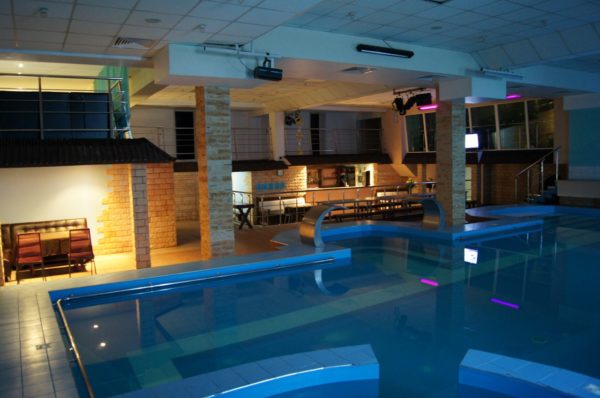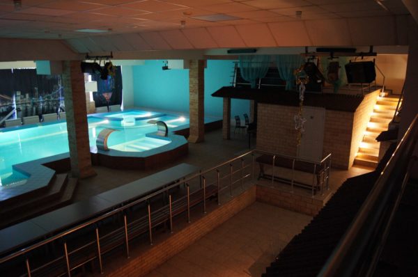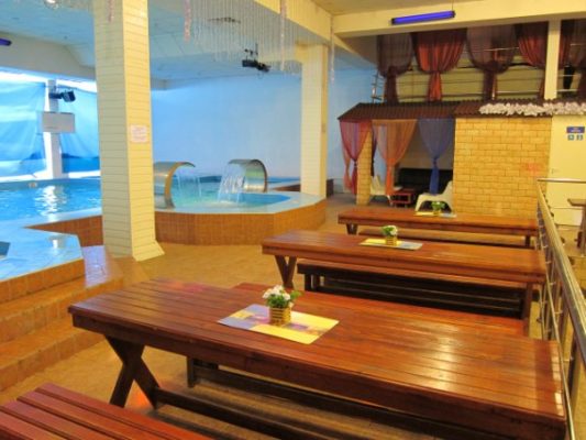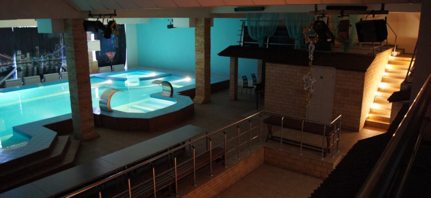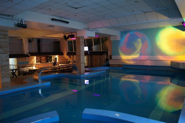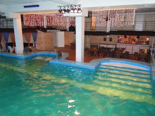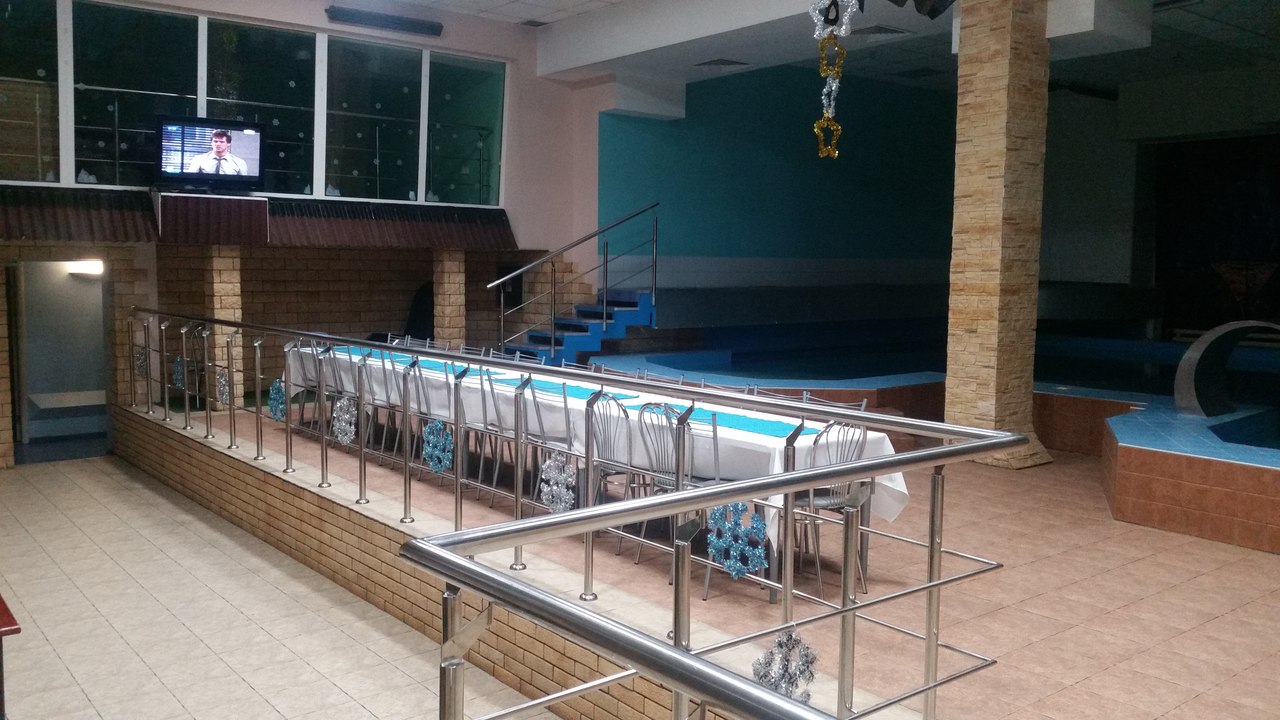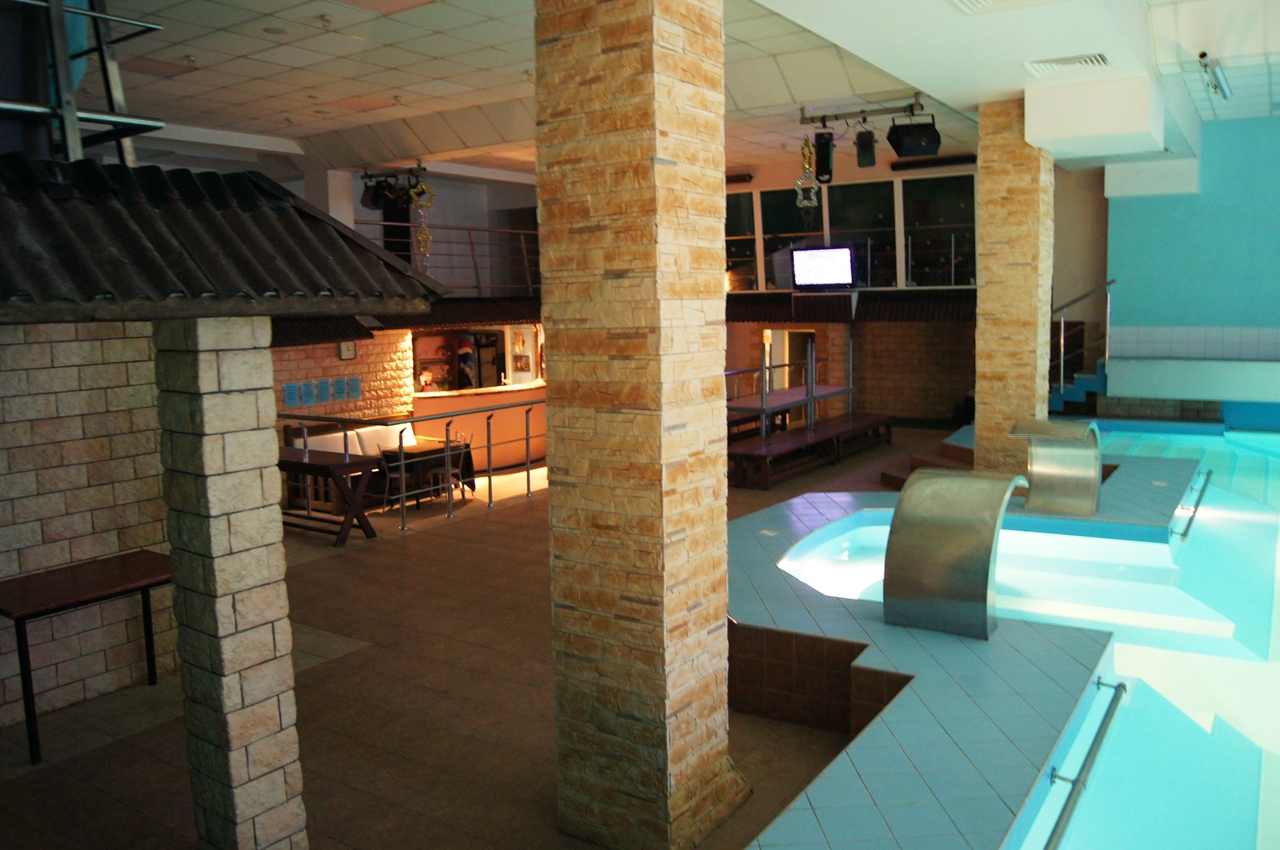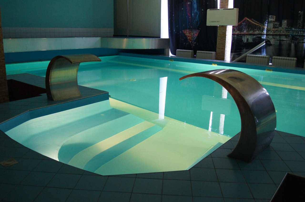 На первом этаже — большой бассейн (7 х 14 м.) с подогревом, двумя водопадами — гейзерами, гидромассажем. В бассейн можно нырять прямо из банкетного зала.