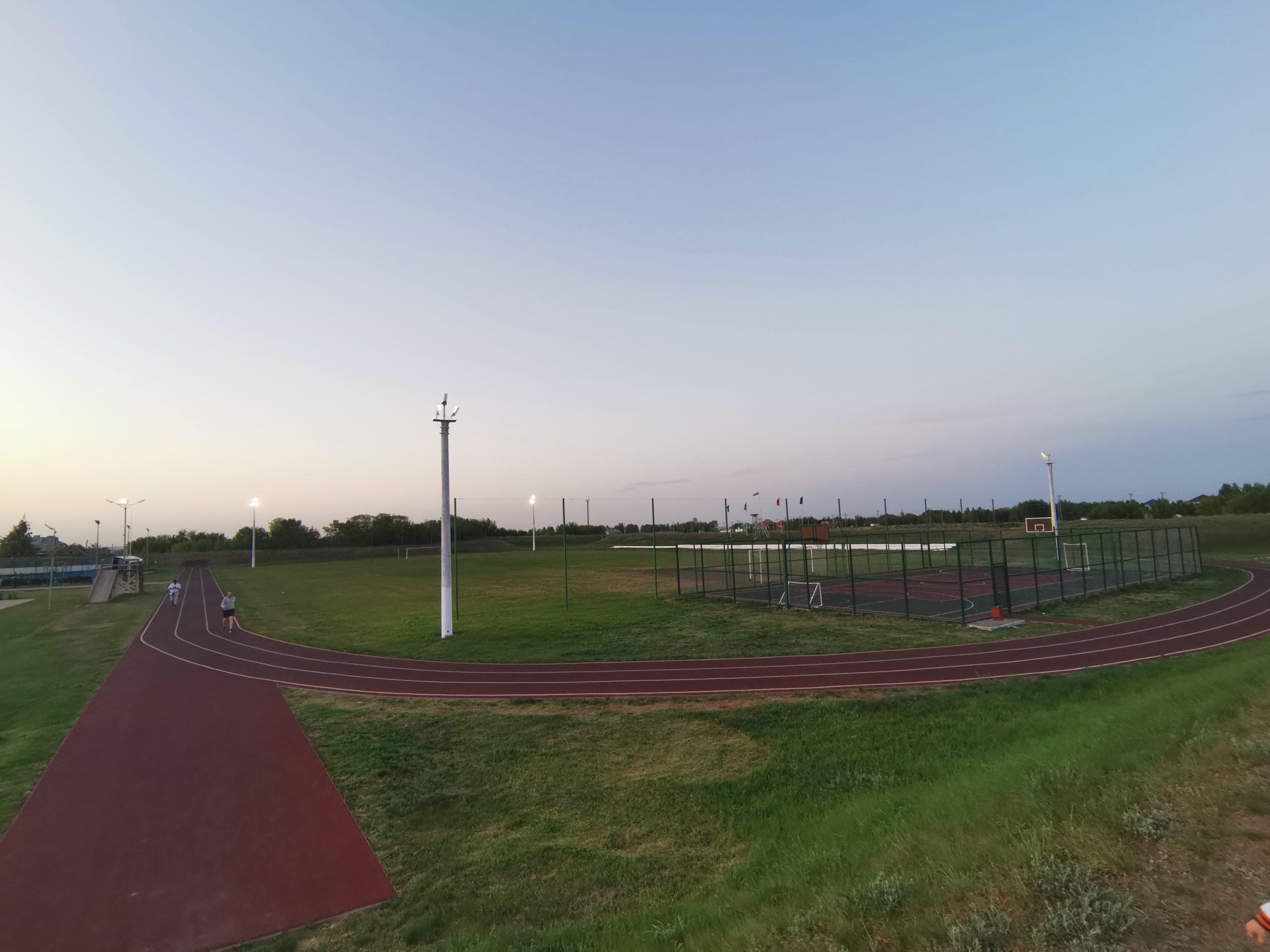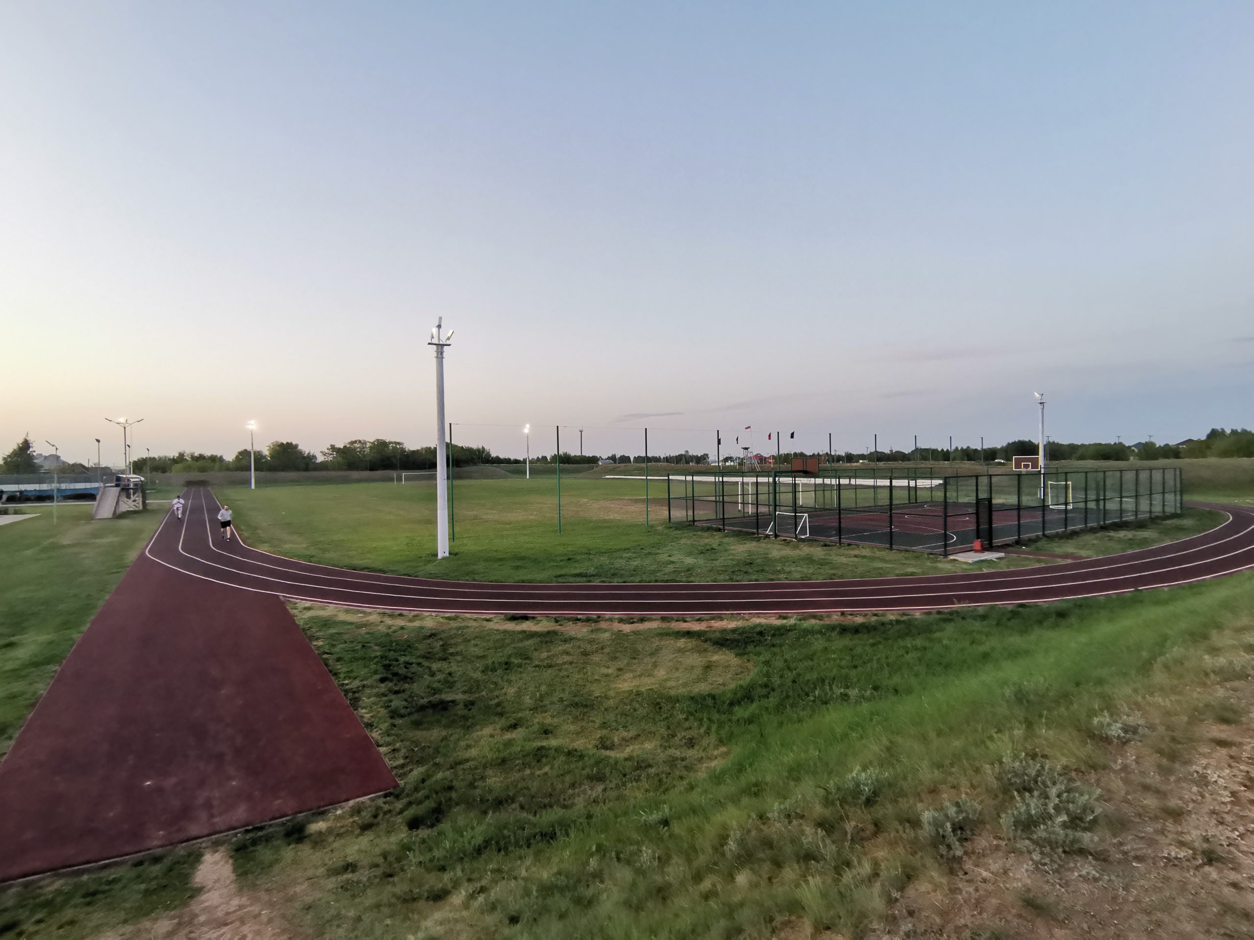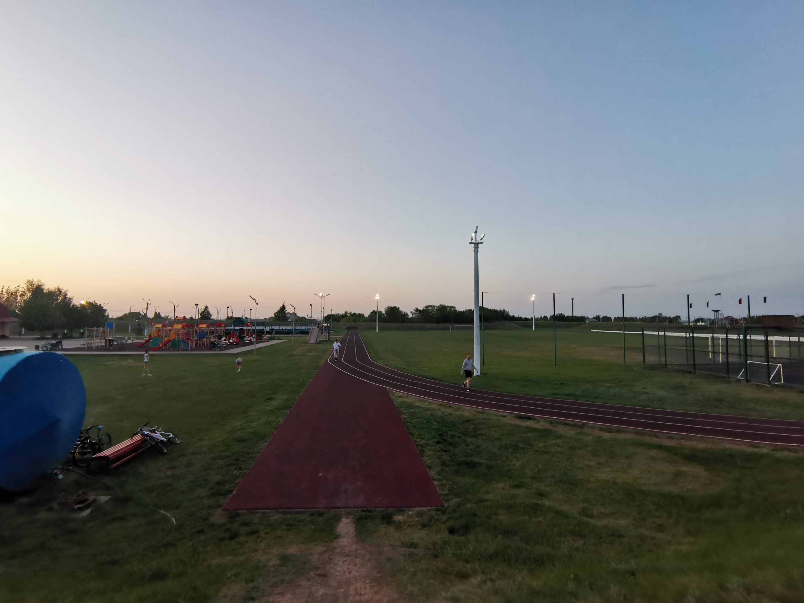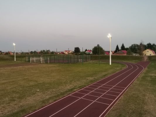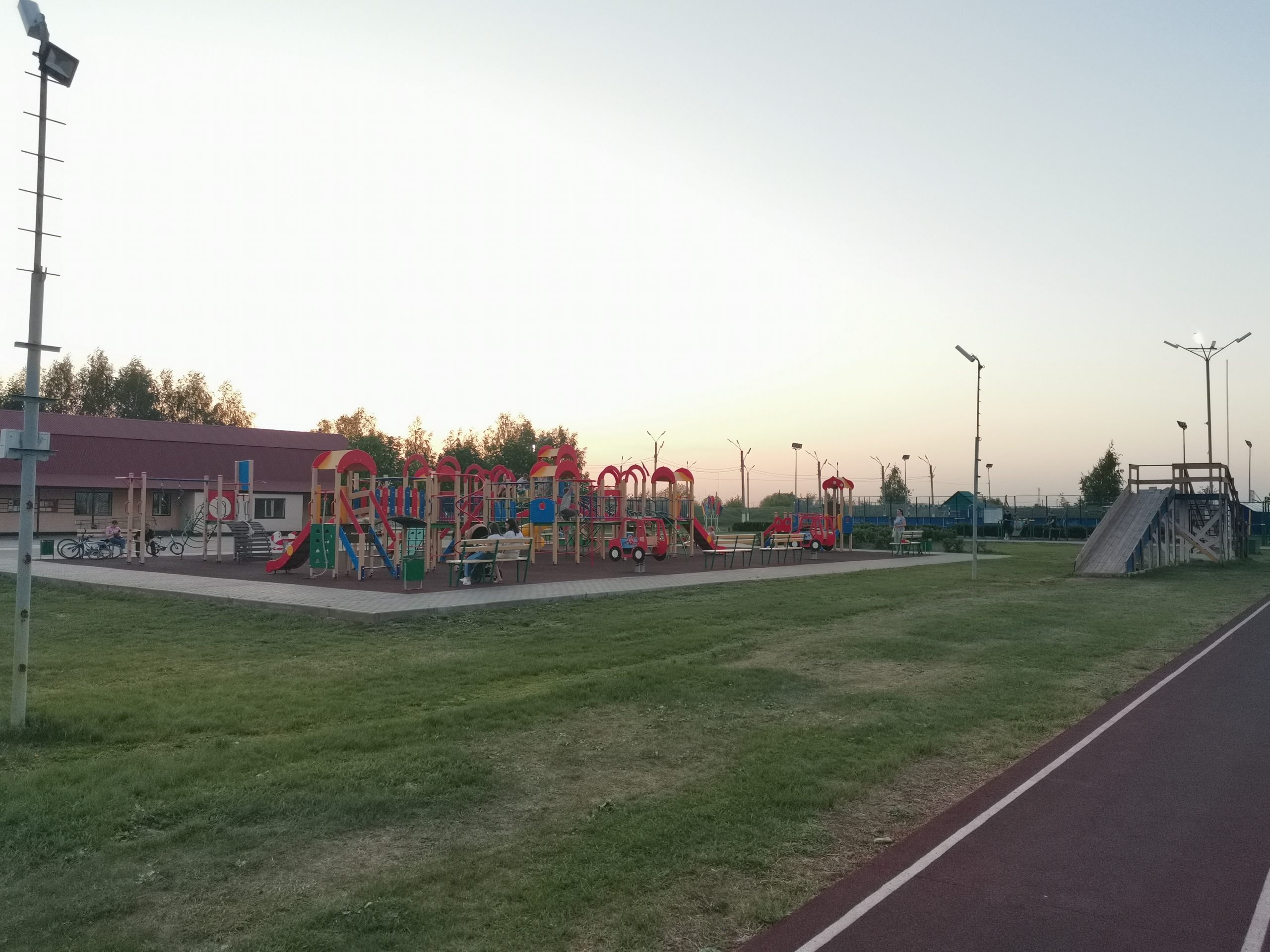 Большой детский городок, беговые дорожки, стадион с естественным травяным покрытием.