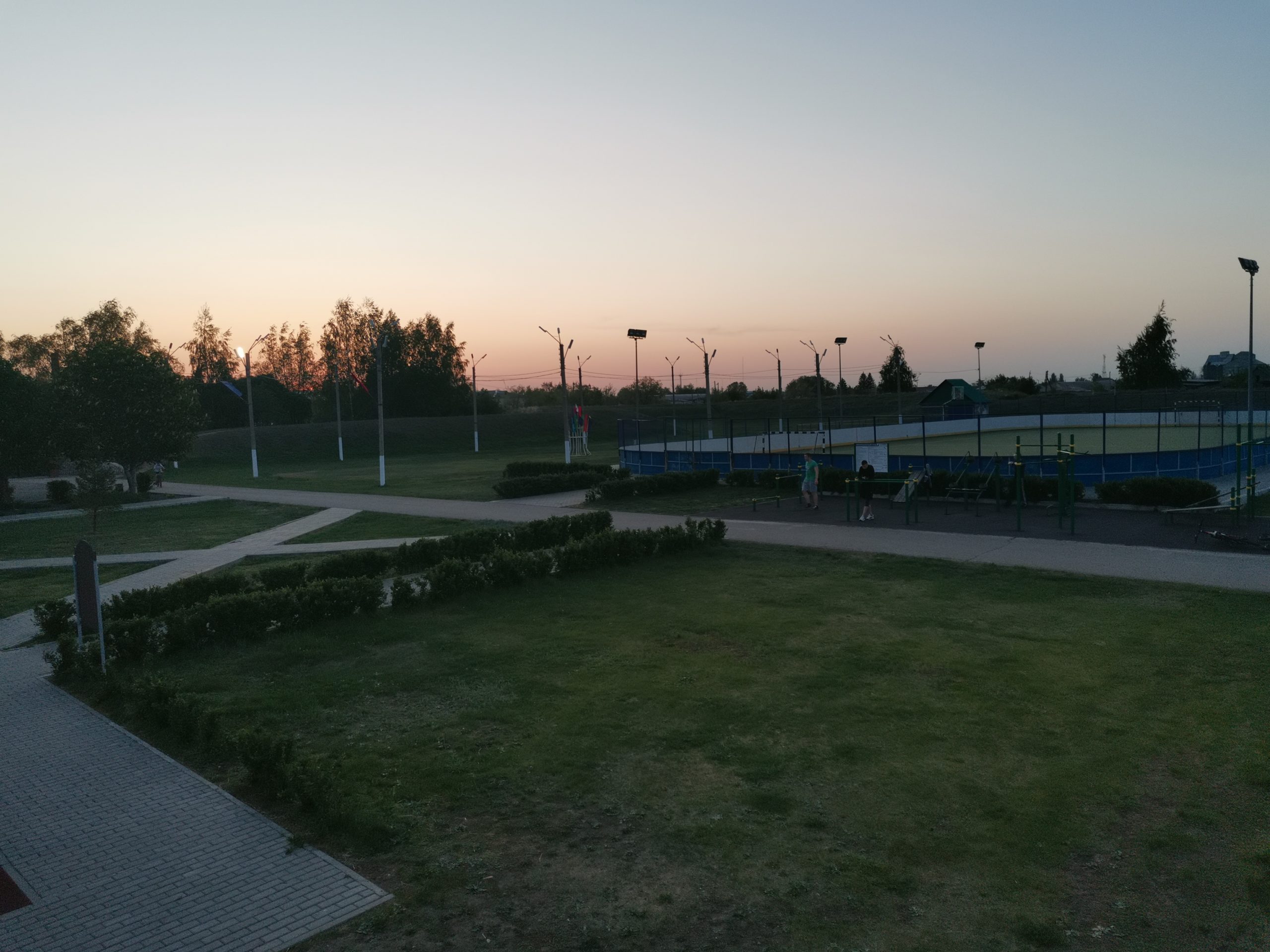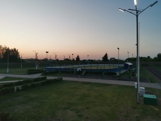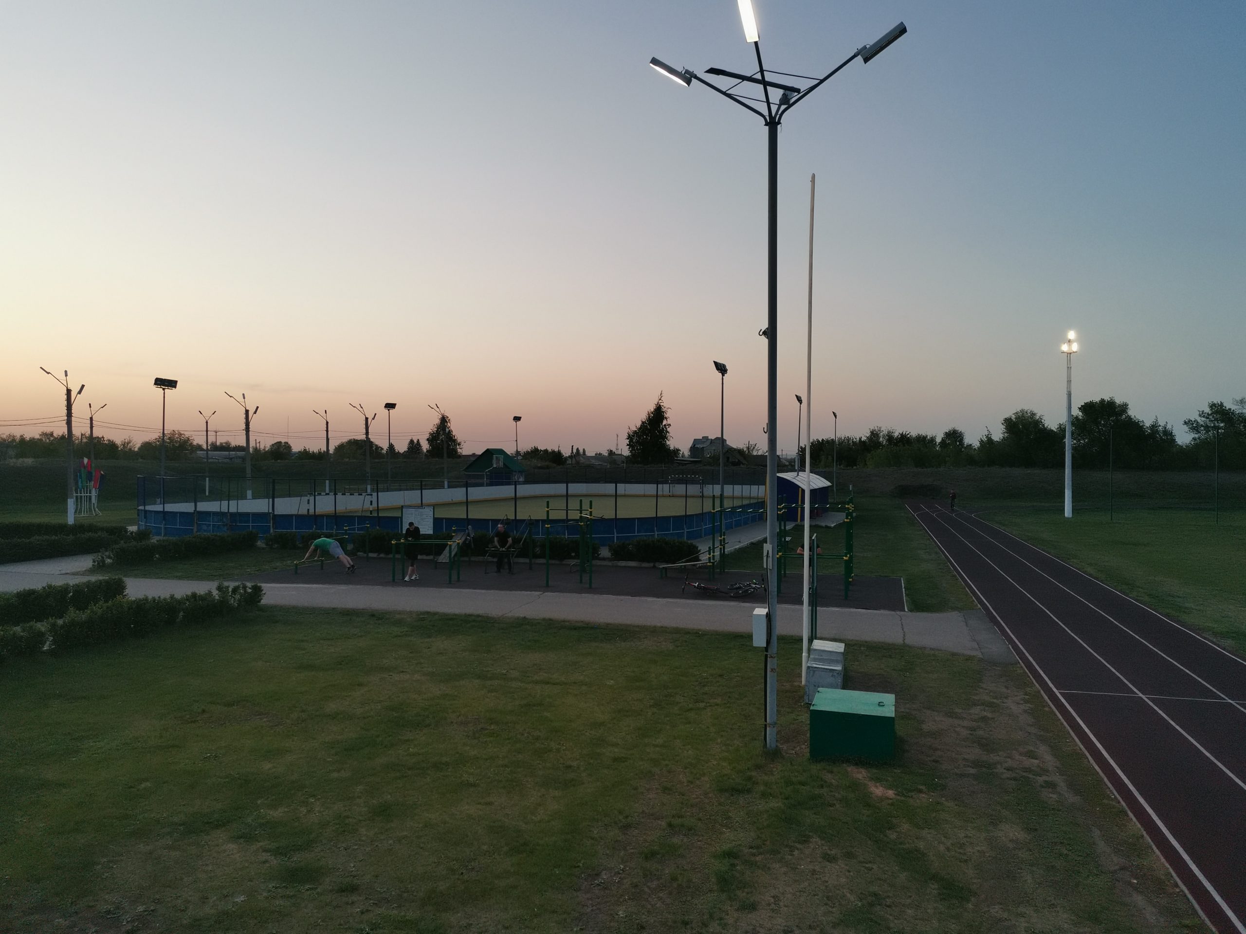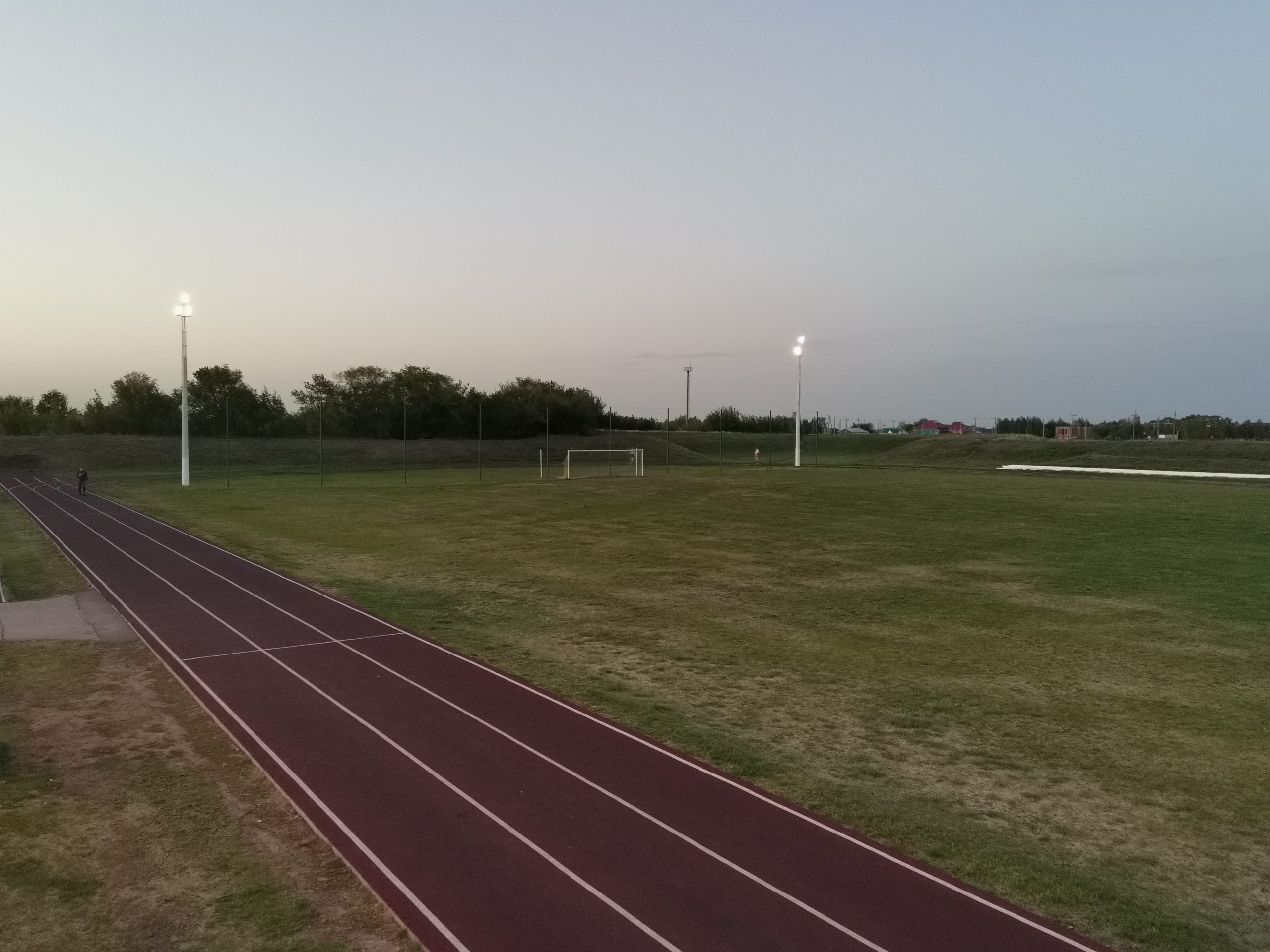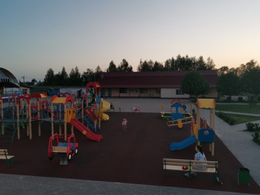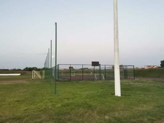 Большой детский городок, беговые дорожки, стадион с естественным травяным покрытием.